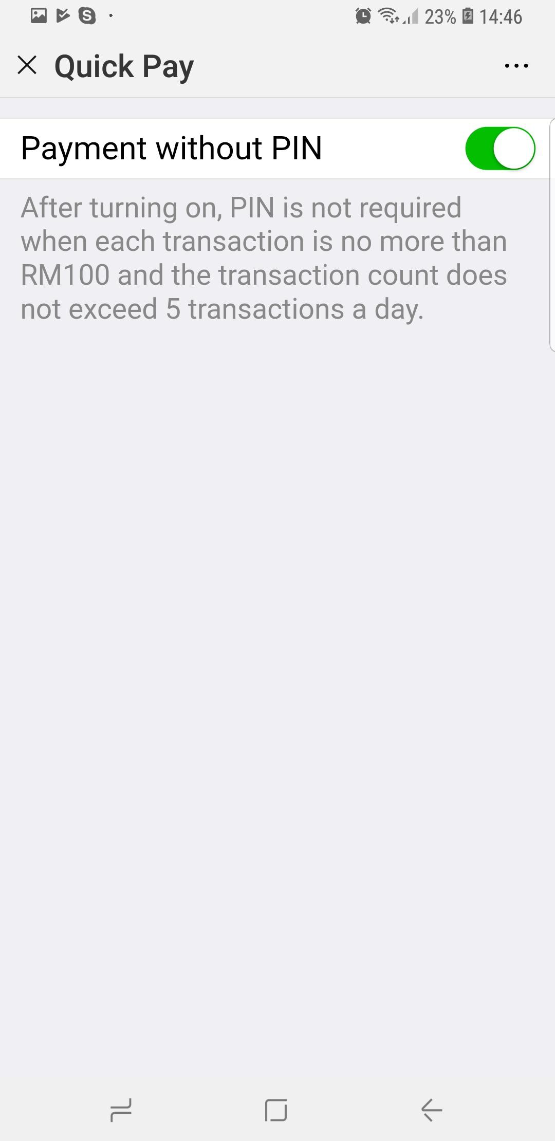 Payment without PIN: After turning on, PIN is not required when each transaction is no more than RM100 and the transaction count does not exceed 5 transactions a day.